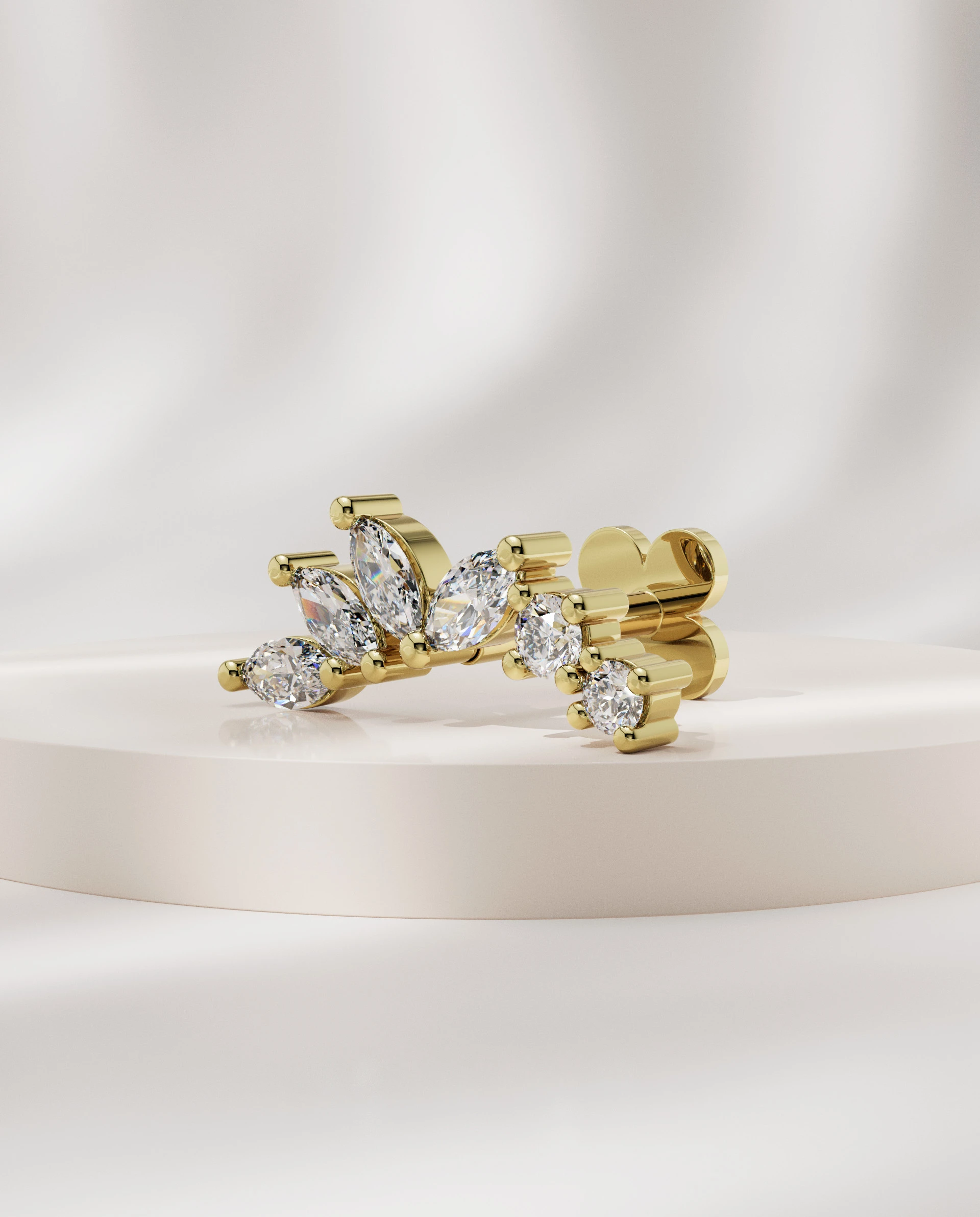 Experience the delicate elegance of our 4 Marquise 2 Dots earrings, a graceful arc of marquise stones in mirrored alignment, finished with two stud accents for a perfectly balanced, refined look.