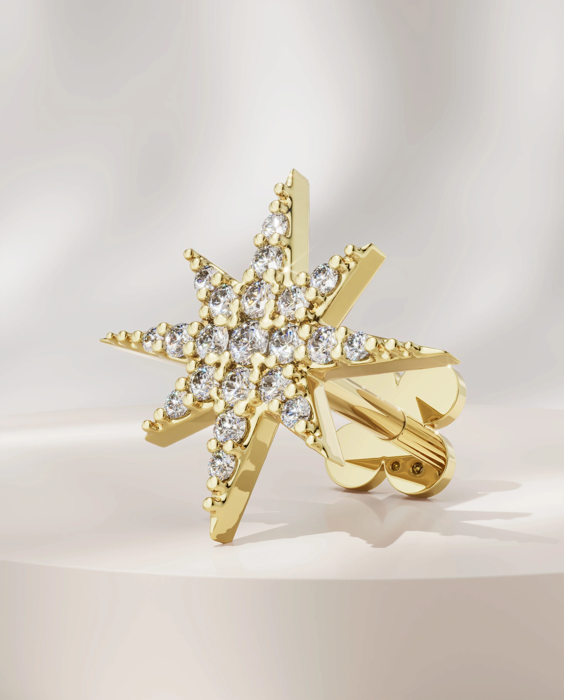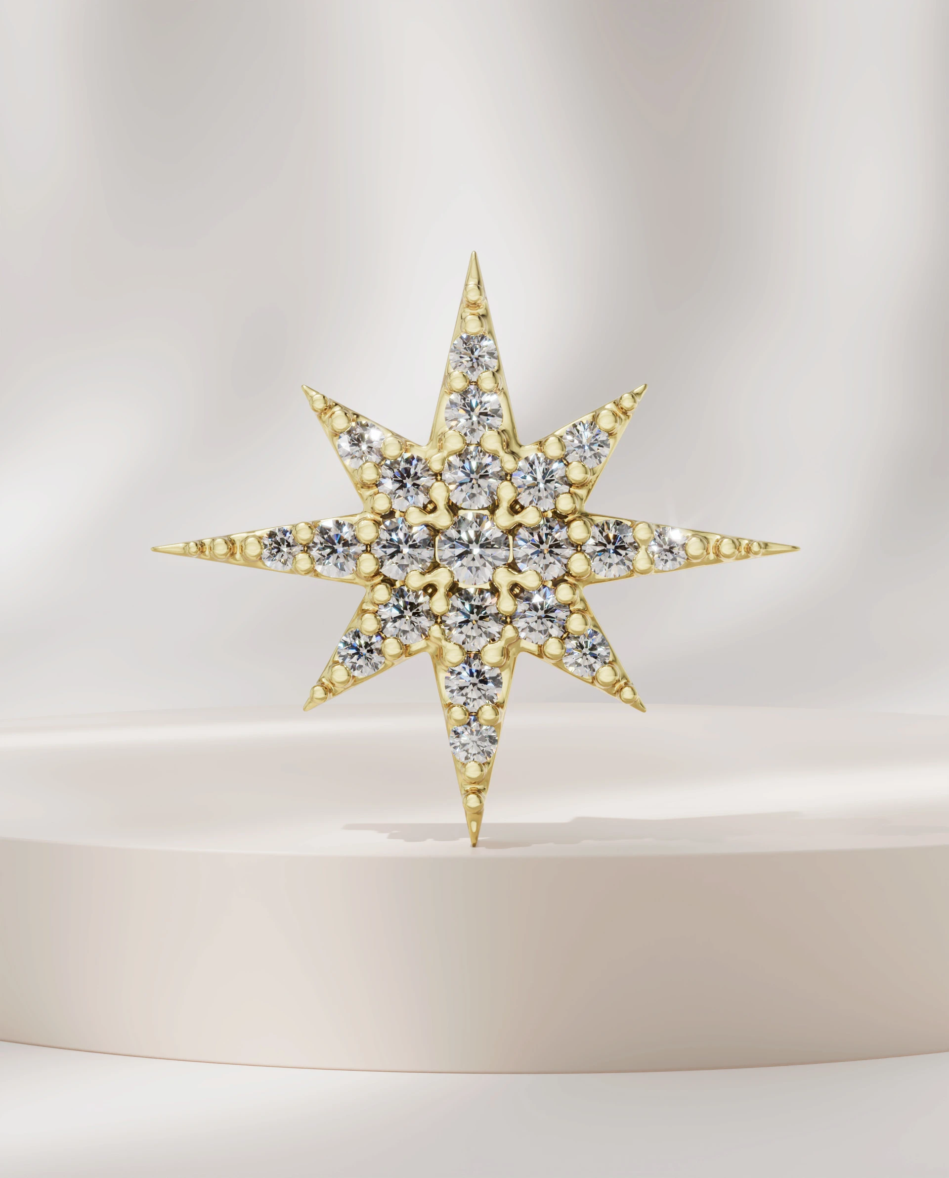 Radiant and powerful, the Sun earring captures the eternal glow of light at its peak. Crafted in warm gold and set with brilliant diamonds, its starburst design reflects strength, vitality, and divine elegance. Each ray extends outward like sunlight touching the horizon, creating a timeless statement of confidence and brilliance.